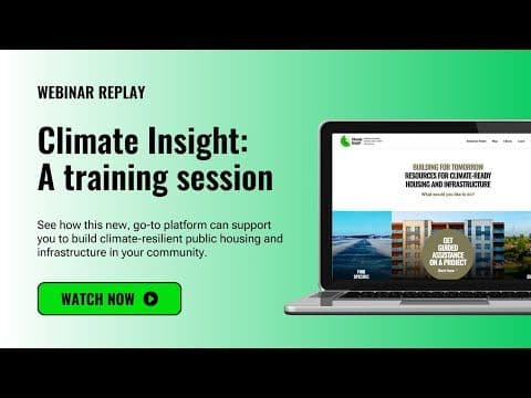 This online training gives an introduction to Climate Insight's initial release launched October 2024. This new online platform empowers communities across Canada with the data and information they need to build low-carbon, climate-resilient public housing and infrastructure.
